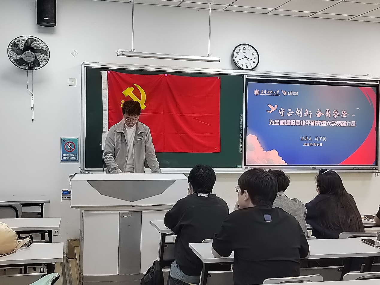 接着,支部党员马宇航作为学校第四次党代会精神学生宣讲团的一员,带领支部全体党员深入学习题为《守正创新,奋勇攀登——为全面建设高水平研究型大学贡献力量》的第四次党代会精神宣讲。马宇航首先为大家阐述了学校第四次党代会的重大意义,强调了会议的里程碑意义,从理论意义和实践意义两个角度分别带领大家进行深入学习。然后,马宇航结合个人成长经历,带领大家从不同角度学习感悟学校第四次党代会精神,他表示:身为科大的一份子,身为一名学生党员,我们要深刻把握学习新时代新征程的使命任务,认真学习贯彻落实我校第四次党代会精神,以“先锋计划”为引领,发挥好先锋榜样作用,努力为我校建设高水平研究型大学贡献我们的青春力量!