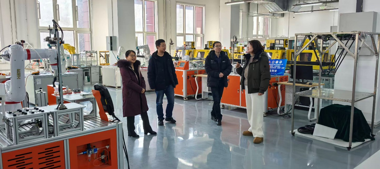 2026年1月23日,天津理工大学太阳集团tyc234cc陈炜教授、张晓涛老师及体育教学部教工第一党支部书记李红艳教授一行三人莅临太阳集团tyc234cc走访调研。教育部机械电子工程专业虚拟教研室优秀基层教学组织的负责人陈炜教授带队,围绕虚拟教研室建设、智能制造产教融合及实验教学改革等议题开展深度交流。太阳集团tyc234cc智能制造产业学院主任房德磊、创新创业中心主任兼机械实践教学党支部书记周婧全程陪同参观并主持座谈。