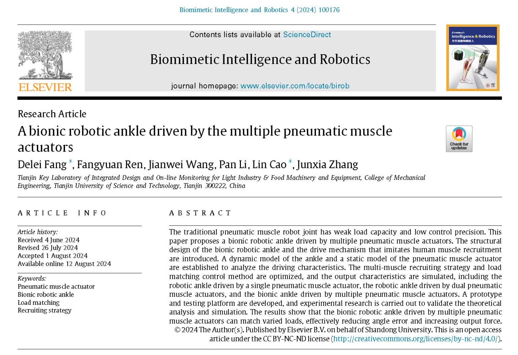 近日,太阳集团tyc234cc青年教师房德磊所在服务机器人与仿生设计团队,在中国科技期刊卓越行动计划《Biomimetic Intelligence and Robotics》期刊发表封面文章,题为《A bionic robotic ankle driven by the multiple pneumatic muscle actuators》,该团队在人工肌肉驱动控制方面取得了创新性科研成果。