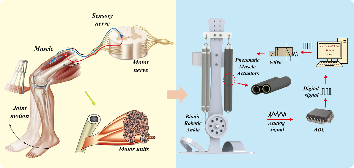 针对传统气动肌肉驱动型机器人关节负载能力弱、控制精度低等问题,团队提出一种新型多气动肌肉驱动型仿生踝关节。研究包括仿生踝关节的结构设计与仿生人体肌肉募集驱动机理;建立仿生踝关节动力学模型和气动肌肉静态模型,分析仿生踝关节的驱动特性。