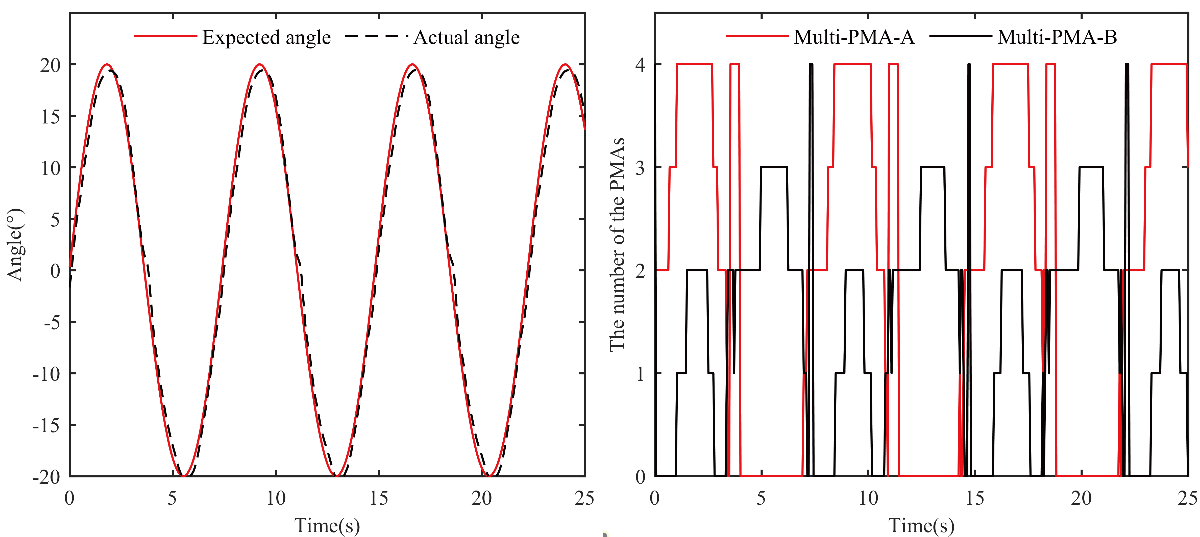 研究表明,该仿生踝关节可以实现多种不同气动肌肉输出组合,增加了负载匹配范围。同时,多气动肌肉型关节可以根据负载变化实现实时匹配输出,尤其在大负载范围,相比传统气动肌肉关节具有良好的角度跟踪性能。以上研究成果在推动穿戴式机器人、智能人形机器人的理论研究与实用发展方面具有重要意义。