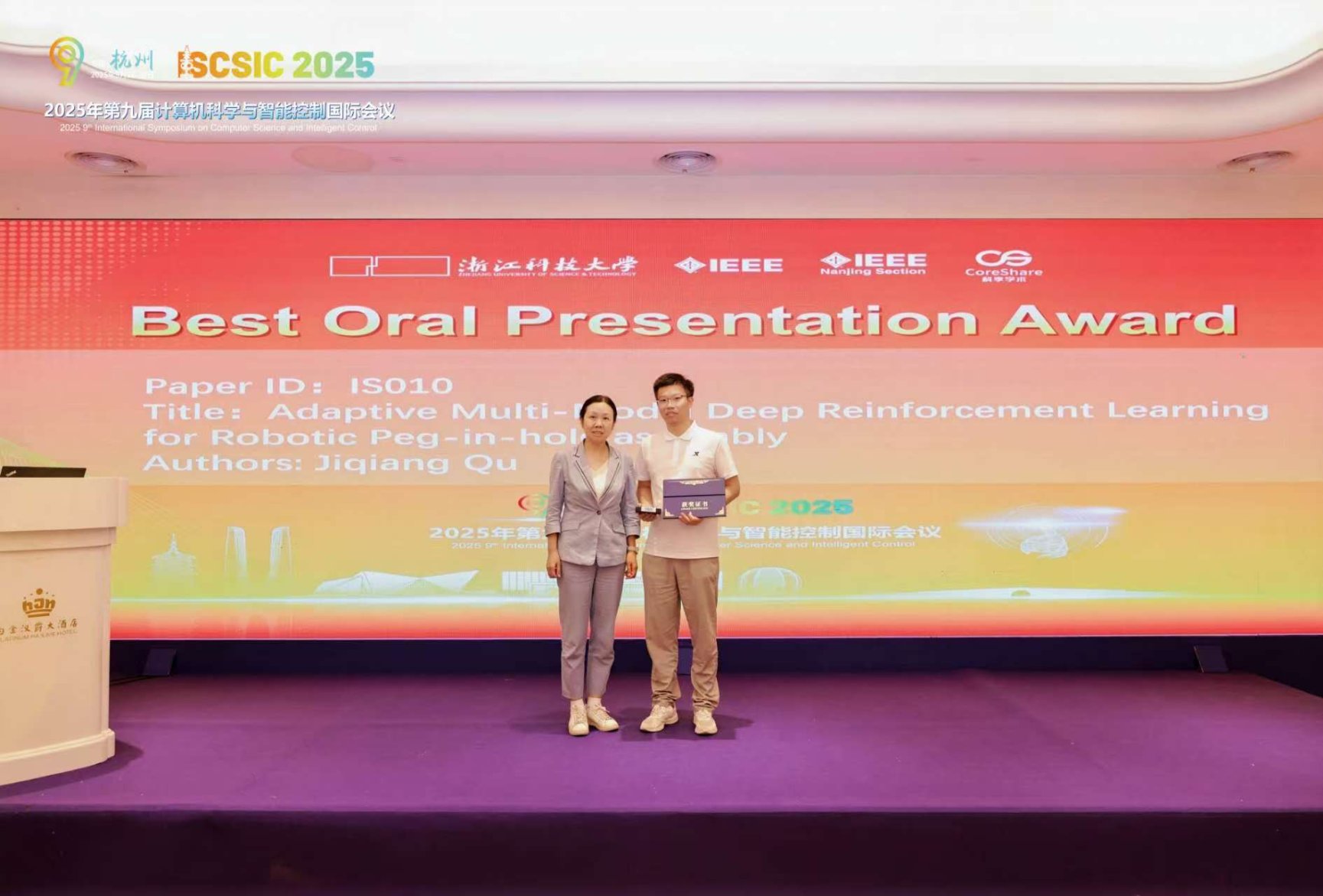2025年9月26—28日,第9届计算机科学与智能控制国际会议(The 9th International Symposium on Computer Science and Intelligent Control,ISCSIC 2025)在中国杭州举行。太阳集团tyc234cc毕德学教授指导的2023级博士研究生渠继强参会并作口头报告,其论文“Adaptive Multi-Modal Deep Reinforcement Learning for Robotic Peg-in-Hole Assembly”荣获最佳口头报告奖(Best Oral Presentation Award)。
