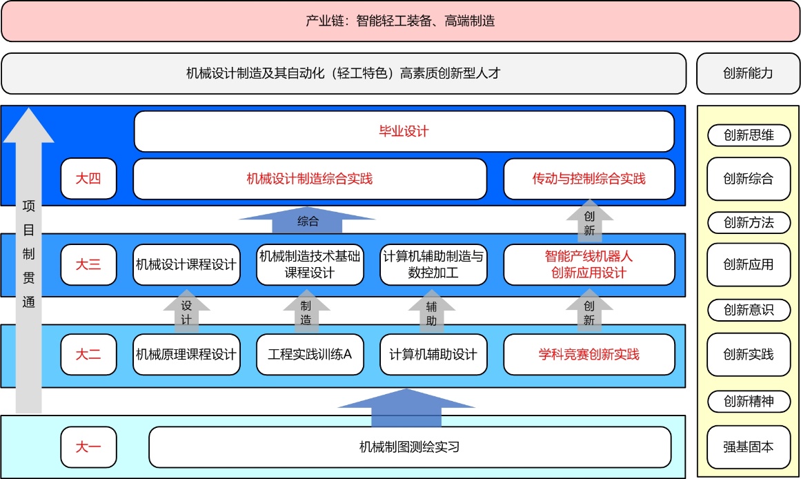 机械设计制造及其自动化专业是一门融合了机械设计、机械制造、自动化技术、计算机科学、控制工程等多学科知识的综合性专业。专业秉承“坚持拓展轻工特色,精心培育行业中坚,矢志服务国计民生”的办学传统,坚持以学生为中心,能力产出为导向的培养理念,形成了围绕设计、制造和自动控制三大主线的“强理论、重实践、交叉拓展、特色创新”知识体系构建模式,建立了教学质量监控评价机制,持续改进人才培养体系和教学过程。