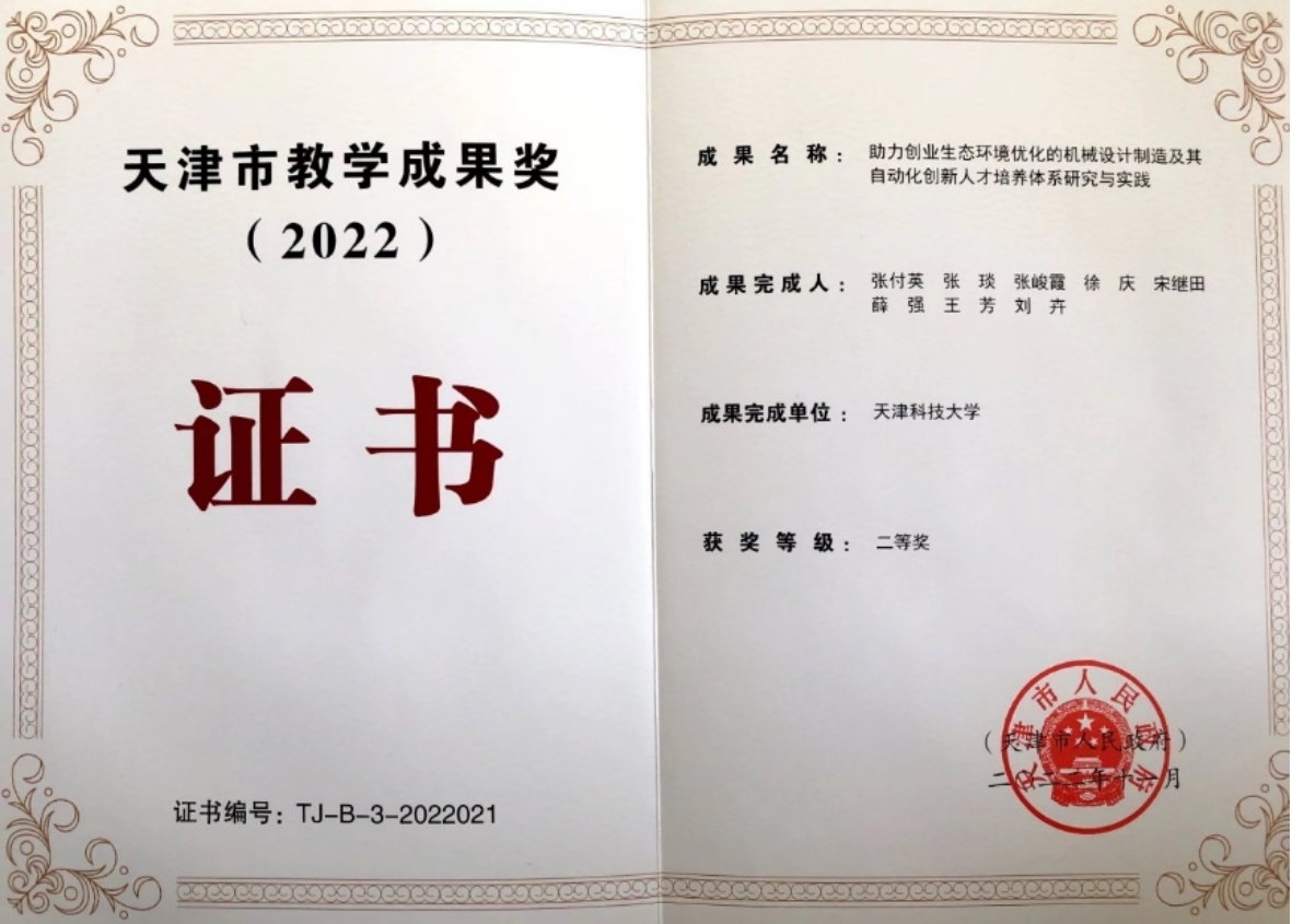 在人才培养上,专业教师多次主持省部级教改项目,发表教改论文,近3年获得天津市教学成果奖两项“助力创业生态环境优化的机械设计制造及其自动化创新人才培养体系研究与实践”、“基于工程能力学科基础课程教学体系研究与实践”。