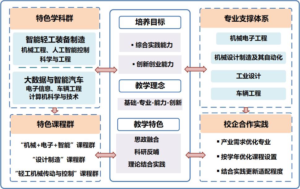 学院依托智能轻工装备制造、大数据与智能汽车学科群,已入选天津市高校服务产业特色学科群;主要涉及专业,如机械电子工程、工业设计、机械设计制造及其自动化等,在持续推进“基础-专业-能力-创新”理念的基础上,建有“机械+电子+智能”交叉课程群、“设计制造”课程群和“轻工机械传动与控制”课程群,真正做到以教师解决国家重大需求工程问题的科研经历反哺教学,结合理论课程和实践环节,着重培养学生的综合实践能力和创新能力。同时按照产业需求导向的专业与课程设置,按学年为周期,优化学科体系与课程体系,有效推动授课内容的更新与适配。