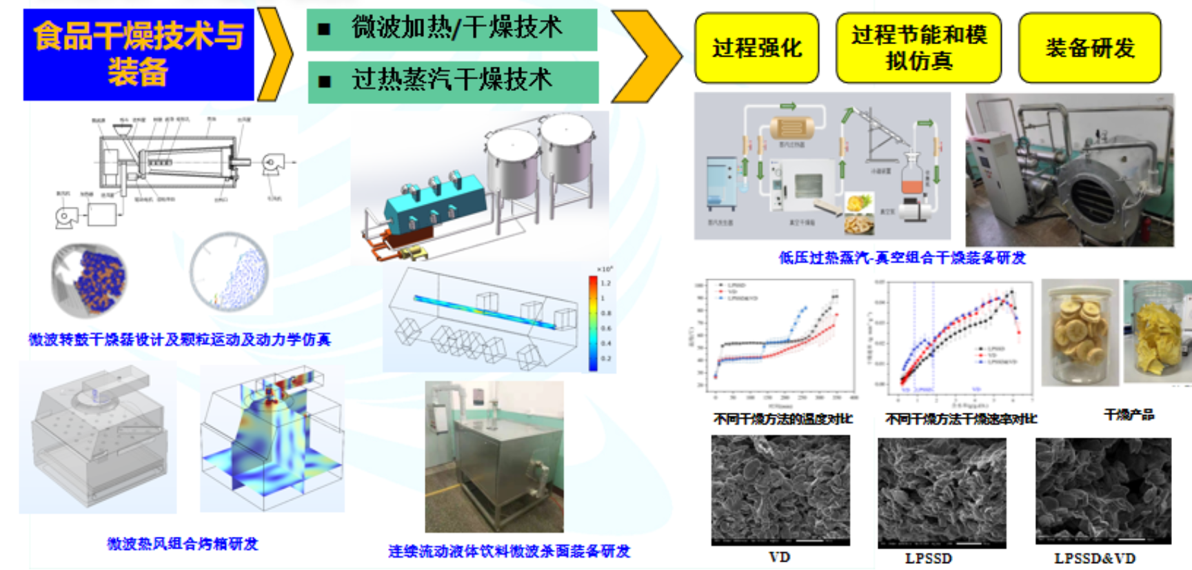 干燥技术与设备团队,是在双碳背景下,面向新能源、生物、医药、农产品、化工等过程行业,基于新能源使用和新产品需求,研究开发新型脱水干燥生产工艺和过程装备。团队现有5名老师,其中教授2名,副教授3名,先后承担国家级/省部级科研项目及横向课题30余项。所开发的连续式真空带式干燥系统在食品、药品和新能源行业均有应用,过热蒸汽干燥-灭菌一体化设备,已经成功应用于食品和制药行业的粉粒体灭菌;基于产品高质量要求研究开发的果蔬切片、中药饮片、谷物、中药丸剂等干燥新工艺,已经在多家企业进行成功应用。基于含湿粉体对微波的吸收与透射原理开发了粉体物料含水率的在线检测装置,并成功进行了示范应用。锂电池前驱体材料的新型生产工艺与装备正在研发。