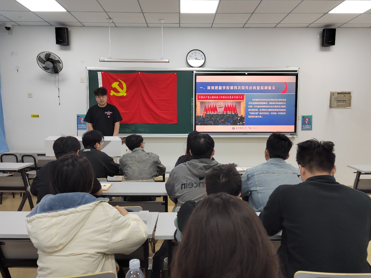 接着,支部党员马宇航作为学校第四次党代会精神学生宣讲团的一员,带领支部全体党员深入学习题为《守正创新,奋勇攀登——为全面建设高水平研究型大学贡献力量》的第四次党代会精神宣讲。马宇航首先为大家阐述了学校第四次党代会的重大意义,强调了会议的里程碑意义,从理论意义和实践意义两个角度分别带领大家进行深入学习。然后,马宇航结合个人成长经历,带领大家从不同角度学习感悟学校第四次党代会精神,他表示:身为科大的一份子,身为一名学生党员,我们要深刻把握学习新时代新征程的使命任务,认真学习贯彻落实我校第四次党代会精神,以“先锋计划”为引领,发挥好先锋榜样作用,努力为我校建设高水平研究型大学贡献我们的青春力量!