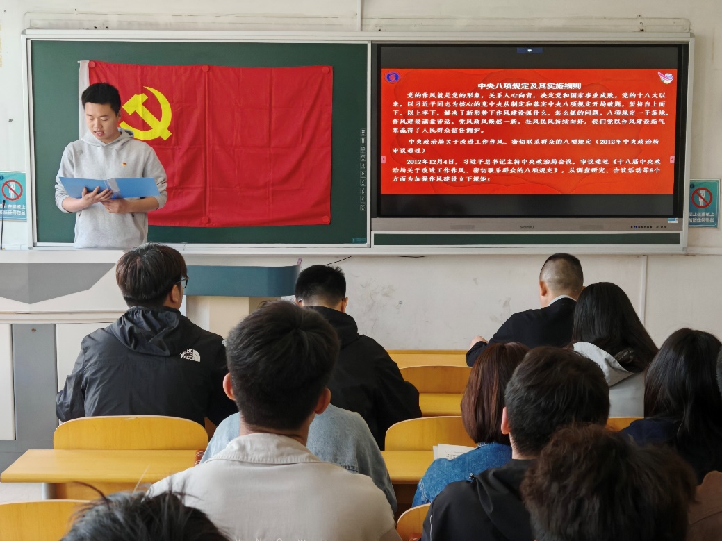 最后,支部书记黄彦老师结合会议主题和支部下一步工作安排提出要求。一是全体党员要高度重视深入贯彻中央八项规定精神学习教育,充分认识重要意义,中央八项规定精神是新时代中国共产党人的一张“金色名片”,是加强作风建设的重要遵循,全体党员要深刻领会中央八项规定精神的核心要义,切实把纪律规矩转化为思想自觉和行动自觉。二是多维度开展学习,深刻领悟精神要义,强化作风建设,提升政治觉悟,从自身做起、从身边做起,发挥党员先锋模范带头作用,融入学习、生活等各方面。三是以全民国家安全教育日为契机,深刻认识国家安全是民族复兴的根基,社会稳定是国家强盛的前提,全体党员要始终贯彻落实习近平总书记提出的“总体国家安全观”,将“国家安全,青春挺膺”牢记于心,身体力行,强化责任意识与法律意识,提高维护国家安全的能力,积极参与到维护国家安全的各项工作中去。