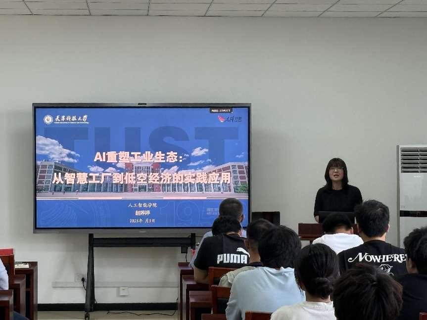 论坛邀请到人工智能学院副院长赵婷婷教授、电子信息与自动化学院林丽媛博士以及太阳集团tyc234cc的张沛森博士、任维佳博士,分别做了“AI重塑工业生态:从智慧工厂到低空经济的实践应用”“AI技术融合与应用探索”“人工智能在医疗诊断中的应用”“复杂环境下的纺品不确定性分析及光谱分类决策机制研究”等主题的报告。每位专家的报告都紧扣“机”与“智”的融合主题,聚焦当前前沿方向,内容丰富,视野开阔,引发了与会师生的热烈讨论。